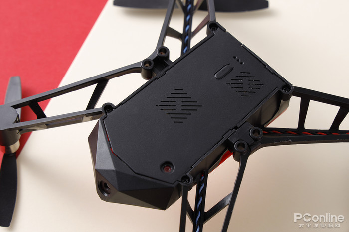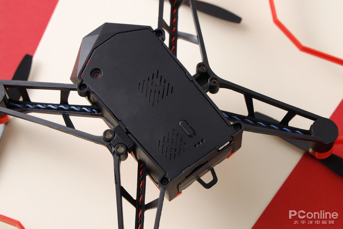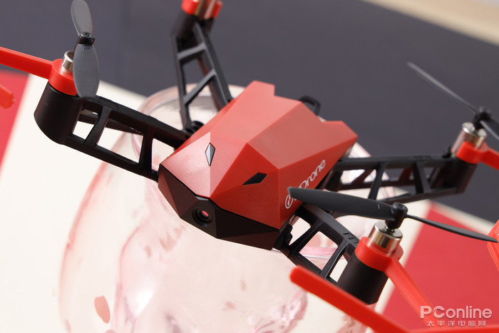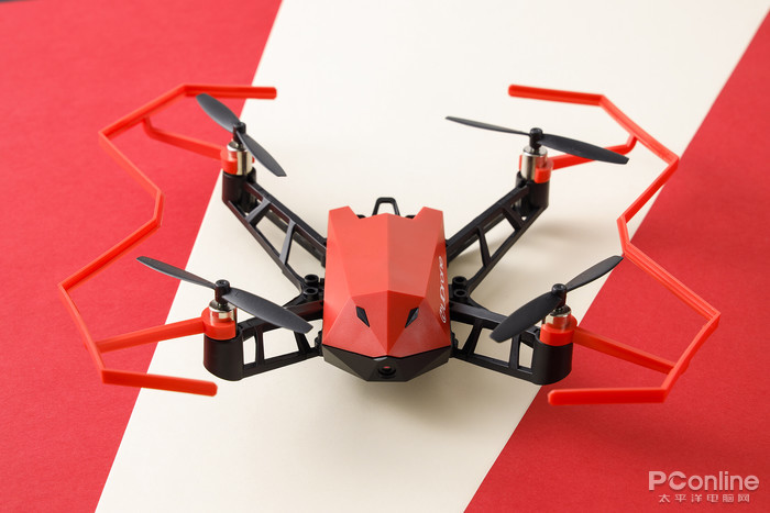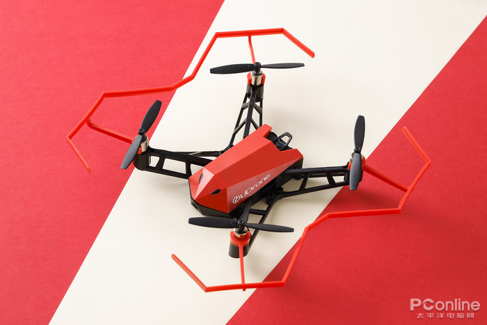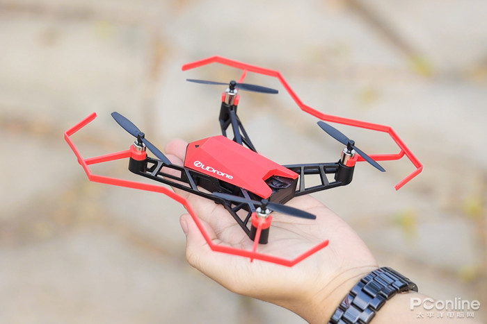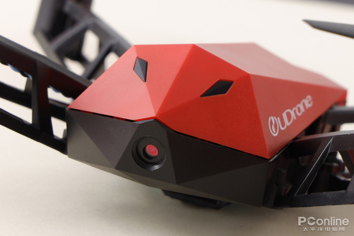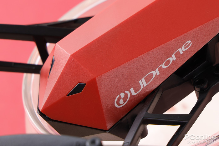 中间主体的外观酷似一条鱼,红色的外壳,还有两只会发光的眼睛,实际上是指示灯。机身旁边还有UDrone的LOGO。