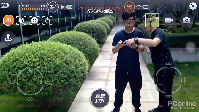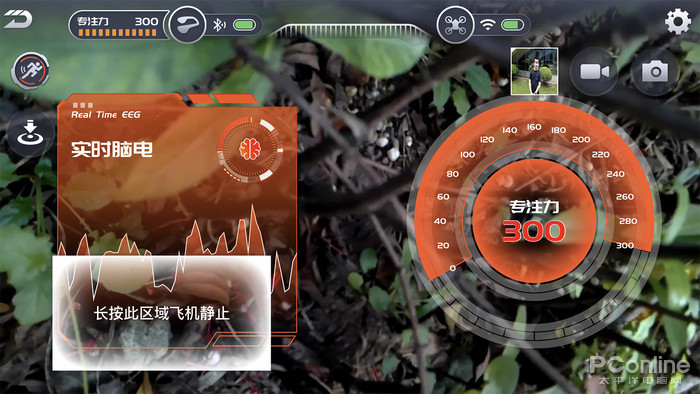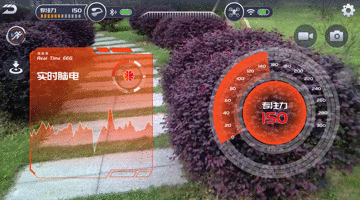 进入飞行控制界面,可以说是非常简洁直观,屏幕上方为UMind Lite意念机的专注力数值、电量,还有AI拍照功能和手动起飞按钮。右边是无人机的电量、设置、录像和拍照按钮。屏幕下方左右有两个虚拟的控制杆,中间是意念起飞的按钮,在使用过程中很通畅,没那么多复杂的设置。
