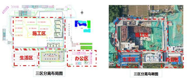 除此之外,项目施工现场按三区分离原则,南侧为工人生活区,北侧施工现场,东侧为办公区,各建筑建材排列整齐,有专门摆放区域,现场整洁有序。