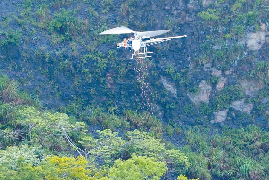 林务局首创使用无人机在偏远崩塌山区洒下种子造林。(农委会提供)