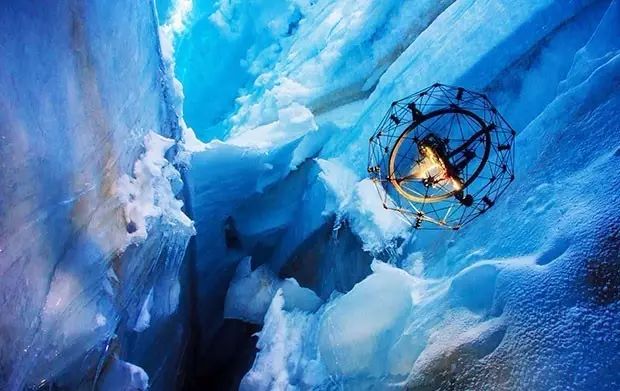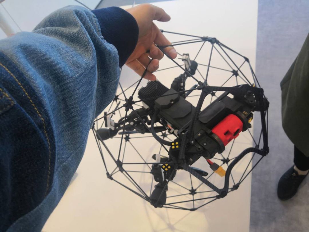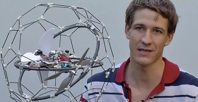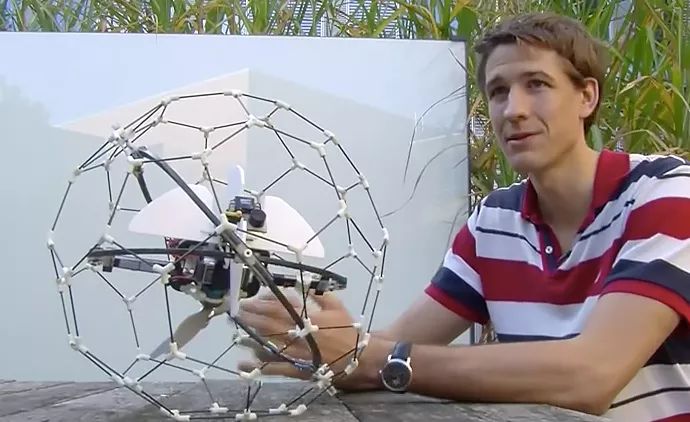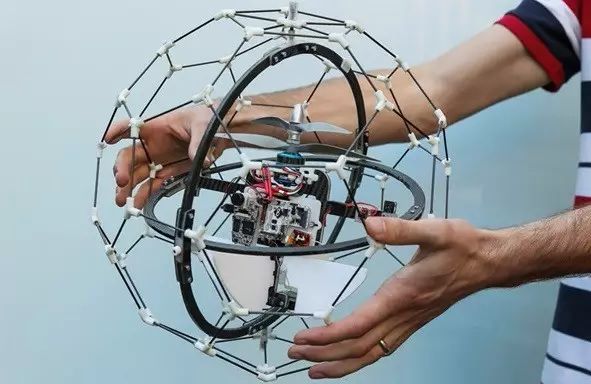 研发团队在无人机机身周围安装了一个多轴球形支架,支架由万向关节连接,像笼子一样将无人机完整包裹起来~