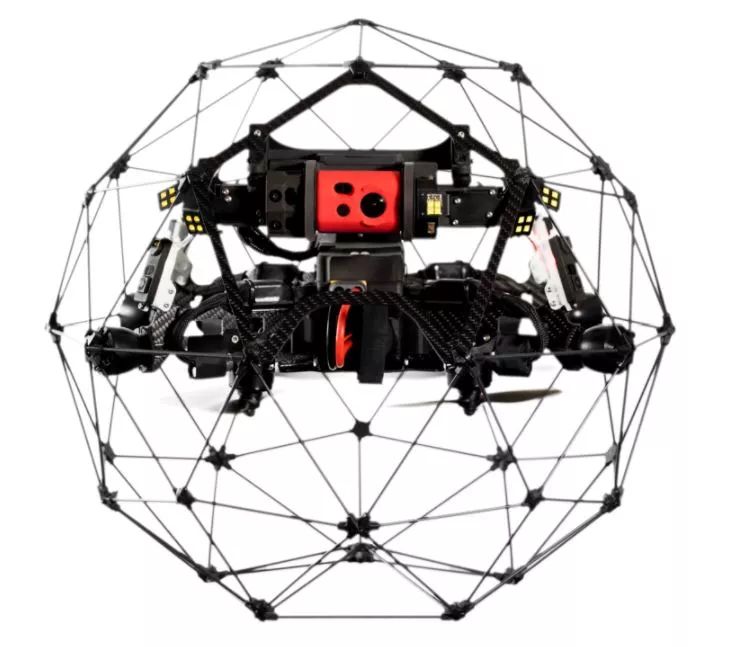 Elios 球形无人机直径为40cm,内部一架双翼无人机,而包围它的支架其实是一层坚韧轻巧的碳纤维网罩。