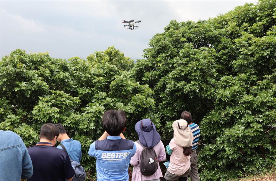 29日无人机喷药观摩由成大研究团队技术授权的擎壤科技示范操作,透过农用无人机飞行时所产生的下沉气流,不仅能够吹拂开果树层层枝叶,更能够完整喷洒至叶背,直接歼灭椿象的幼虫和成虫。