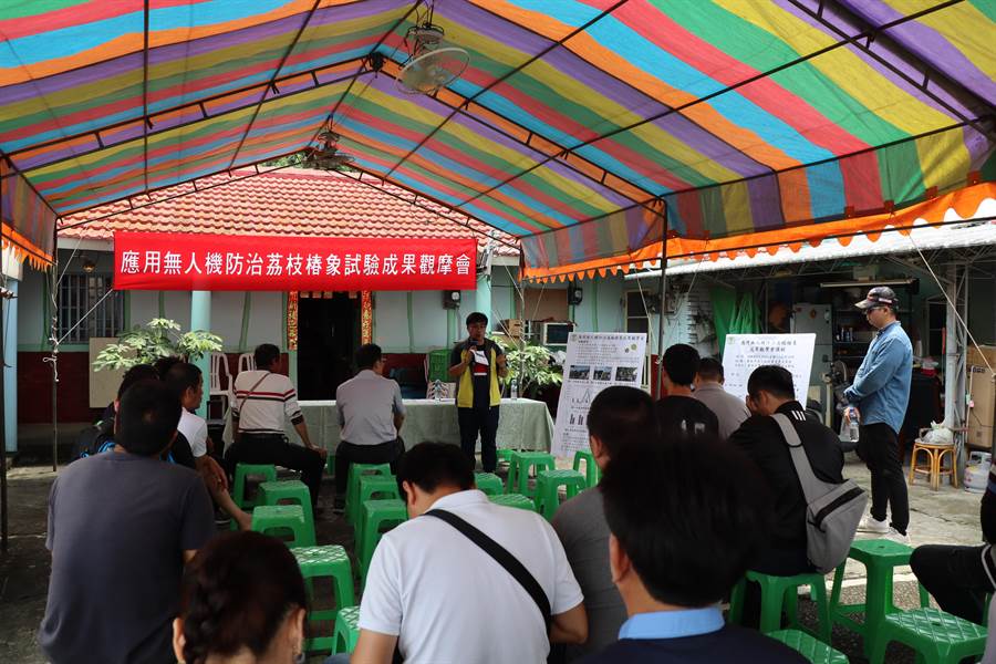 荔枝椿象肆虐,台南市南化山区徐宝强农友的龙眼园也无法幸免,今年2月起经由南化农会协助,与台南区农业改良场进行无人机喷药防治荔枝椿象试验计画,数月下来成效良好,29日举行成果观摩会,与会农友纷纷询问使用方法及费用。