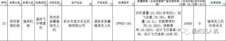 2019年5月27日,浙江省农业农村厅关于公布2019年第二批农机购置补贴产品、中央农机新产品、省级农机补贴产品和植保无人机补贴试点产品信息表的通告,新乡昌杰植保无人机3WWDZ-16A进入浙江省农机补贴产品归档目录。