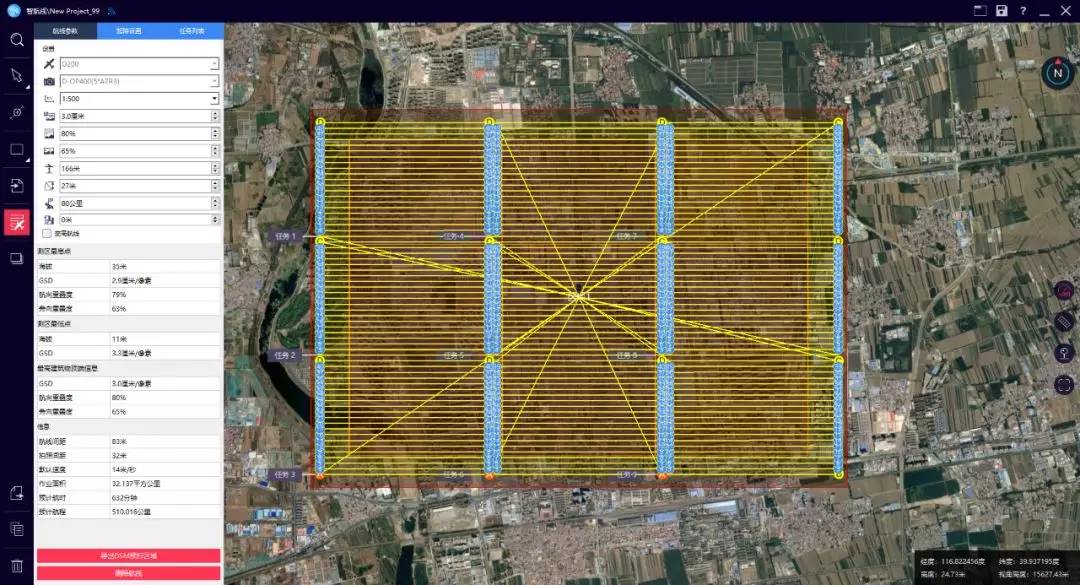随着技术及应用的发展,越来越多的大面积倾斜任务,因无人机航程及控制半径原因,需要对较大测区进行划分,无人机管家智航线中会自动对大区域进行划分同时考虑区块间的重叠度,保证效率最大化。