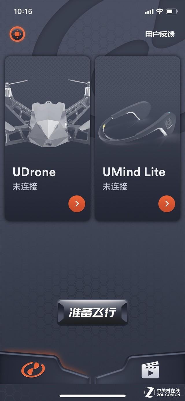 在UDrone意念无人机的包装上,贴有UDrone APP下载所用的二维码,用户扫码即可开始下载APP。下载好之后,进入APP,可以看到非常简洁的界面,这对于新手用户来说十分友好。界面中的按钮很少,用户只要通过点击就可以快速上手,无需任何说明都可以直接进行使用。