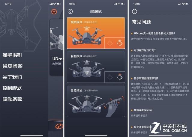 点击UDroneAPP左上角的按钮,可以弹出这款APP的核心辅助功能,包括新手指引、常见问题、关于我们、控制模式、隐私条款几个选项。对用户最有帮助的就是新手指引、常见问题和控制模式三个选项。上图中间是控制模式的修改界面,用户可以根据需求修改,每个模式括号中有说明。上图右侧是常见问题,如果对UDrone无人机飞行和使用有疑问,这里基本上都可以直接找到答案。