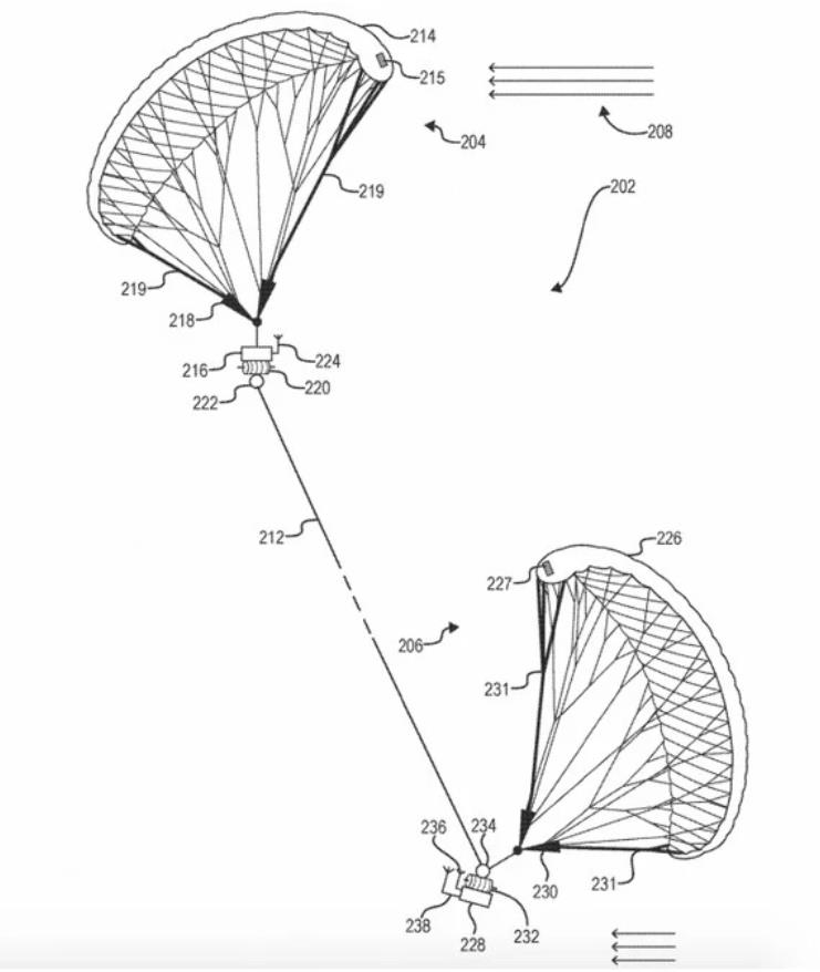 根据专利内容显示,这台“无人机”的工作方式大概是通过把无人机连接到两个风筝上,风筝之间有一根1公里上的绳子连接,每只风筝可以独立漂浮,飞行操控则通过人从地面操作无人机实现方向、高度、速度的控制。