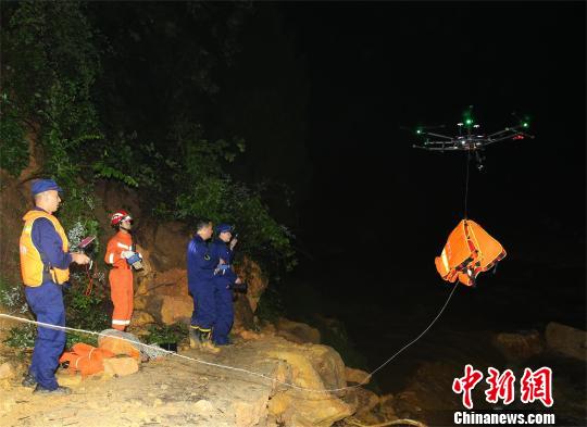 山间低温加上缺乏食物饮用水,三人已极度困乏饥渴。救援人员借助无人机为他们送去食物、救生衣、救援绳等物资。指导他们穿上救生衣后,救援人员再次利用无人机向河对岸投放绳索,并通过对讲机指导他们把救援绳固定。