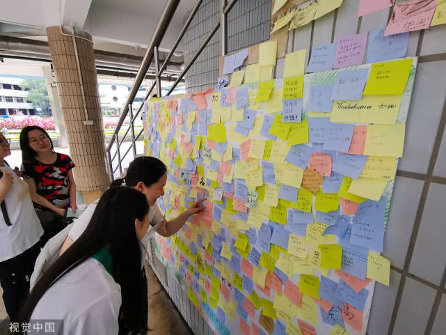 广州,华南师范大学附属中学考点,墙壁上贴满了对高考生的祝福。