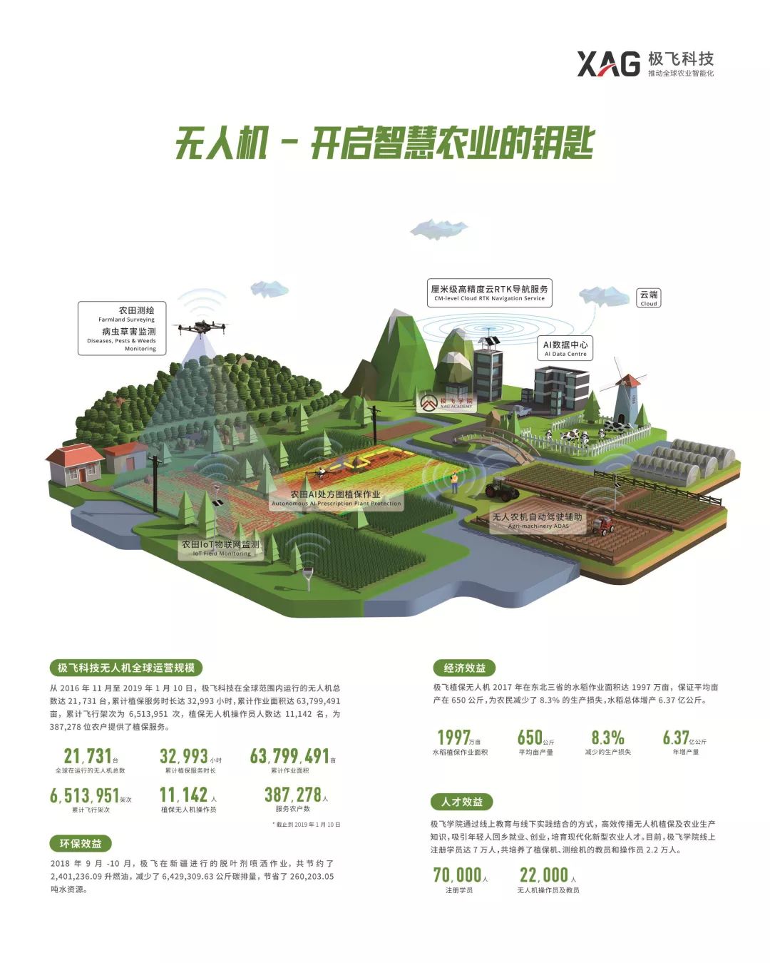 秉持“承载技术,服务农业“的理念,极飞研发并制造了能够完全自主飞行的 P 系列植保无人机及系统、极飞地理 C2000 智能测绘无人机和极飞物联智能农田监测站等产品,形成了智能农业的生态闭环,为智慧农业的发展带来了全新的技术和商业模式。在过去的5年里,极飞的测绘和植保无人机服务了约4200万亩中国农田和100多万农户,植保无人机全自主飞行总架次超过439万架次,飞行总里程超过745万公里(相当绕地球飞行近200圈),成为全球运营规模最大、经验最为丰富的无人机企业。截至2018年7月底,极飞在全球运营的无人机已经超过 13,000 架,服务范围涉及中、英、美、澳、日、韩等20个国家。