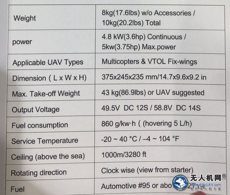 首先是H2发动机,这款产品根据官方介绍,无人机使用3.7升汽油就可以飞行2.5小时以上。重量约为5.2kg,稳定功率达1.8kw最大可达2kw,尺寸为260mm*312mm*325mm,可适用于中小型无人机。这款发动机可工作温度-20~40°C ,最大升限为海平面1000m,可以说适用于目前大部分的无人机了。同时,这款发动机在17年举行过一次跨海飞行,由两台搭载着H2发动机的无人机持续飞行上百海里,成功跨越渤海海峡某处,实现了一次惊人的壮举。