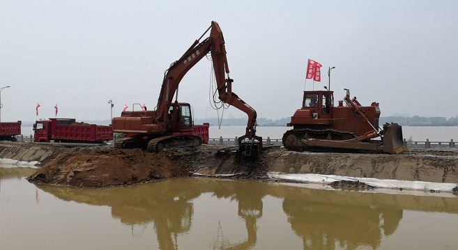 演练现场,工程车、推土机、挖掘机一辆辆专业设备紧张地进行联合作业,这是中国安能集团采用钢木土石组合封堵和大型机械抛填块石封堵决口的场景。