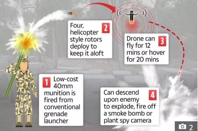 墨尔本国防科技公司 DefendTex ,上月在佛罗里达举行的军备会议上,展示了一款只有 40 毫米的低成本小型军火无人机 Drone-40 ,机身可装置炸药,上方设有 4 轴桨翼,当无人机从手榴弹发射器射向高空,首先可飞越最多 6 英里的空域,其后桨翼可使手榴弹悬停达 20 分钟,或有 12 分钟续航力飞行至目的地,飞行速度约每小时 45 英里,以使其可以在空中进行伏击,潜入敌方目标并作远程引爆。