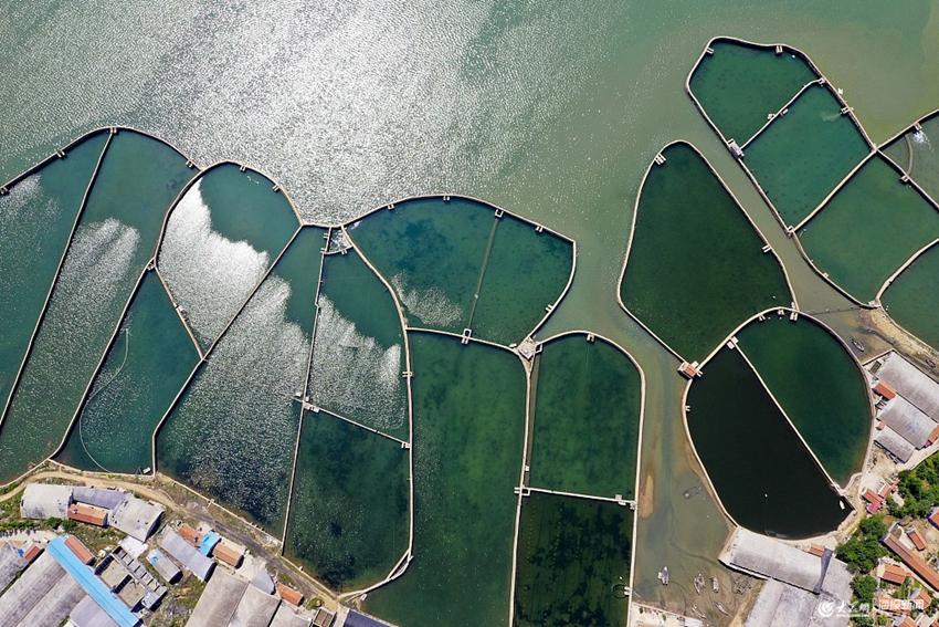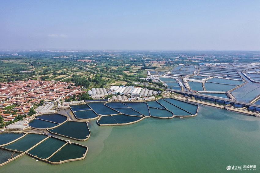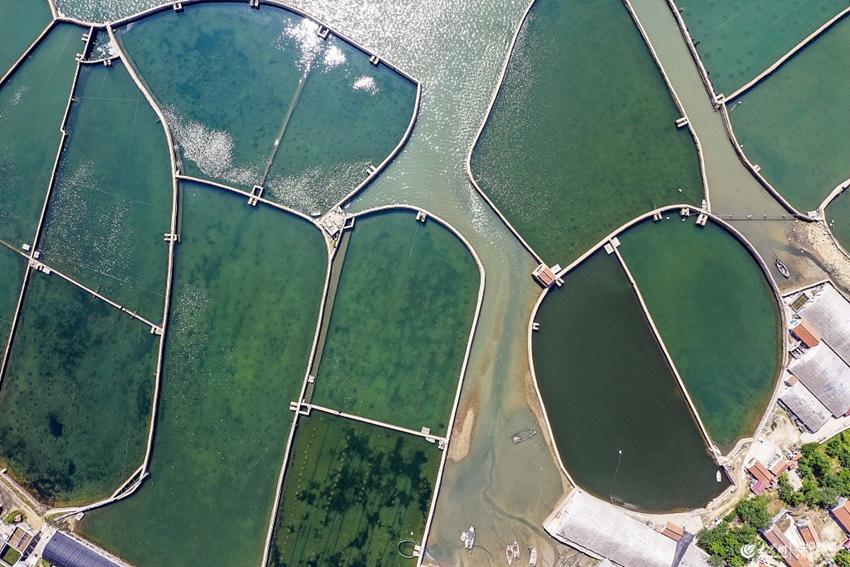 2019年6月11日,山东青岛西海岸新区董家口经济区,航拍陈家贡湾的美景,在阳光的作用下,连绵的养殖池里的海水呈现出蓝色和绿色两种迷人上午...