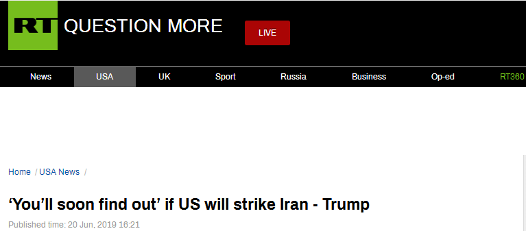 RT称,特朗普周四在会见加拿大总理特鲁多后谈到伊朗击落美军无人机一事。