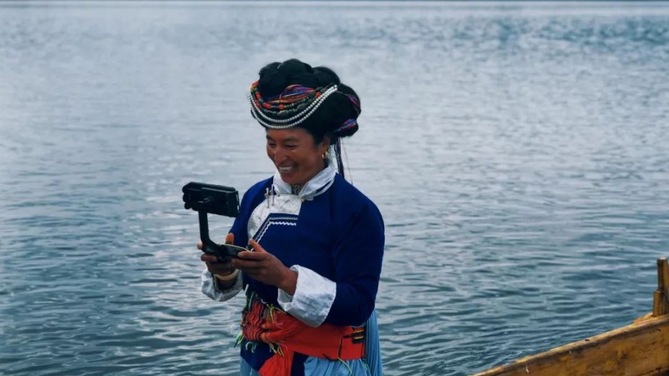 不仅是老祖母,几乎每个在场的泸沽湖本土居民,都像是远道而来的游客,在听一个当地人讲述不为人知的故事一样,好奇与期待挂在他们脸上,一种民族与科技的融合感瞬间让每一帧画面都多了一种独特的味道。