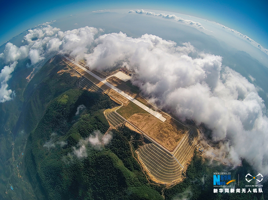 三峡六月中,风光不与四时同。时下正是六月时节,三峡库区夏雨不断,雨后的长江三峡云雾翻腾,再添壮美之感。图为无人机视角下的巫山机场,雨后云雾漫山,机场如在云端。