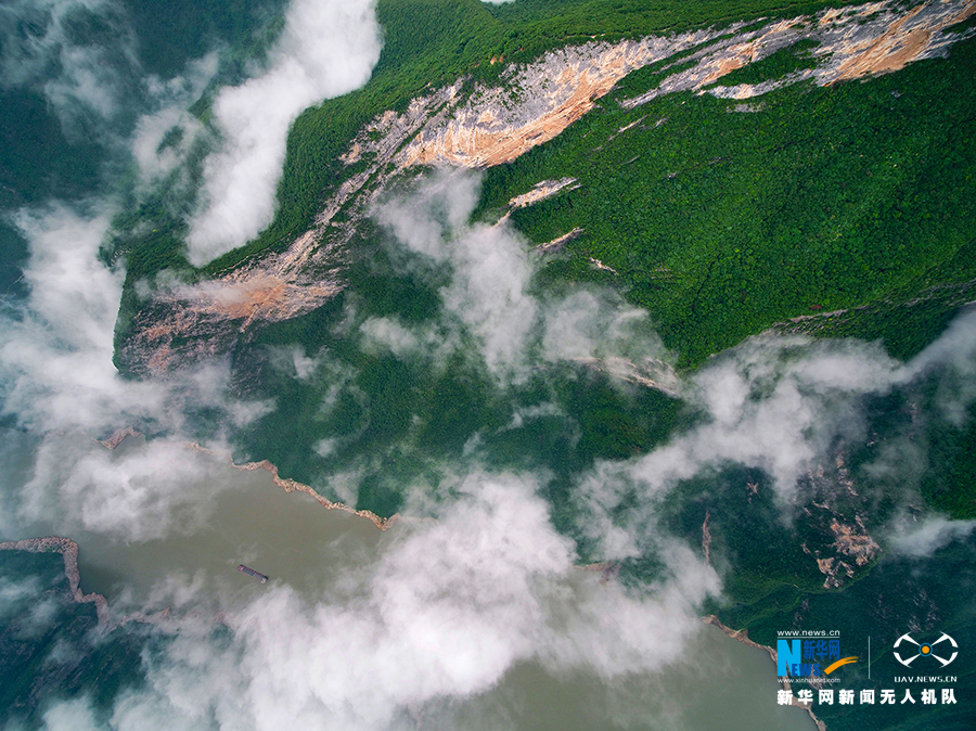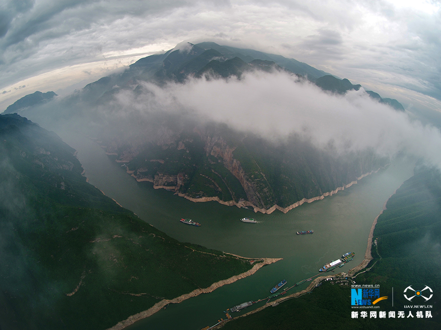 三峡六月中,风光不与四时同。时下正是六月时节,三峡库区夏雨不断,雨后的长江三峡云雾翻腾,再添壮美之感。图为无人机视角下的雨后瞿塘峡,一艘货轮穿行于云雾之中。