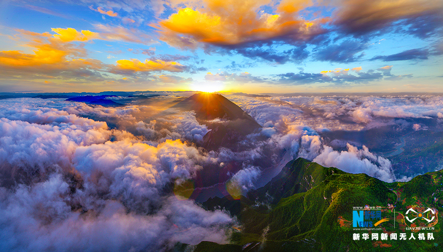 三峡六月中,风光不与四时同。时下正是六月时节,三峡库区夏雨不断,雨后的长江三峡云雾翻腾,再添壮美之感。图为无人机视角下的雨后瞿塘峡,日出之时,朝阳的光辉洒向三峡的山山水水,展现出“朝辞白帝彩云间”之美。