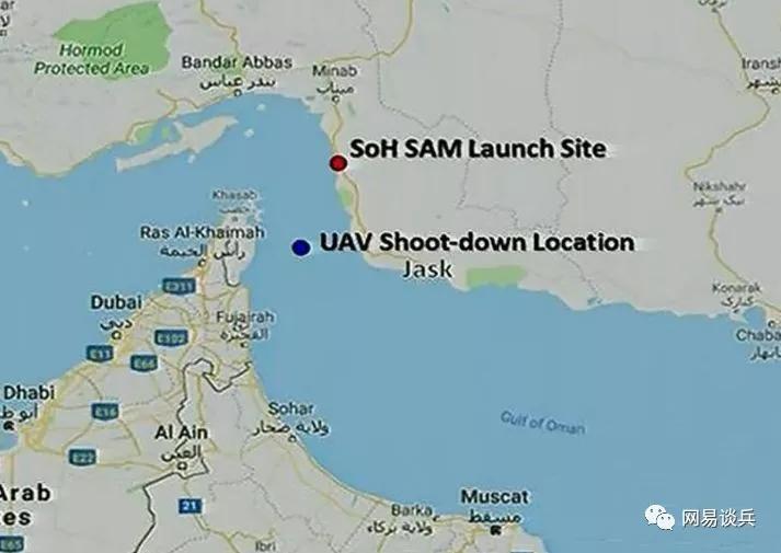 上图为伊朗公布的美军无人机被击落地点(蓝点),和防空导弹发射地点(红点)。下图伊朗武装力量频道公布的导弹发射前视频截图,为“Sevome Khordad”系统。