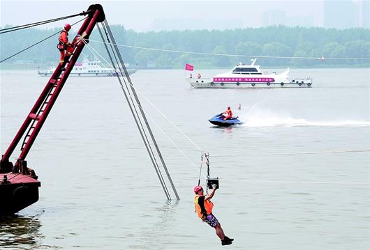只见数架无人机携带救生圈救生设备紧急升空,飞到落水者上空进行精准抛投,为落水者争取等待救援时间;水域救援机器人也迅速出动,在救援队员的遥控下,躲过水面障碍物驶到落水者身边,将其驮回岸边的安全地带;救援队员驾驶摩托艇将其余落水者一一救起。随后,几名救援队员用救生抛投器将绳索抛至对岸,架设横渡绳桥来到被困区域,将被困人员营救至岸边。