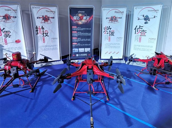 国飞航空多款消防无人机亮相,共轴双桨的多旋翼结构保障了机身的更加稳定。同时,这三款无人机分别采用了投弹、喷射干粉、喷射水枪三种消防灭火模式,只为更好的解决中国的高层楼房的灭火难题。