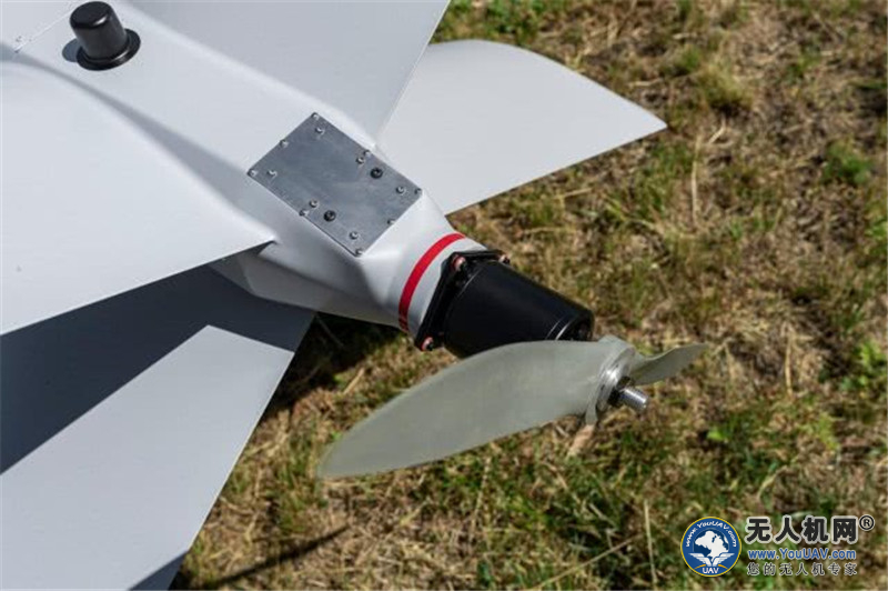 “柳叶刀”无人机尾部特写,看起来很简单,采用两片式螺旋桨推进,应该是电机动力,机体内安装蓄电池。电机动力比较安静,便于隐蔽巡航,不像航模内燃动力噪音偏大。但是由于整体重量才几公斤,电池不可能很大,因此也制约了续航能力。