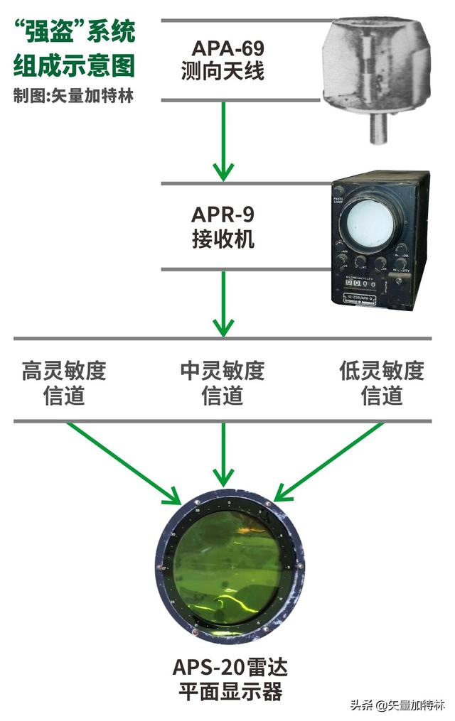 技术人员使用一具APR-9接收机与天线连接,输出的信号同时馈入三具灵敏度不同(高、中、低)的放大器,然后再送到APS-20雷达的平面显示器上。