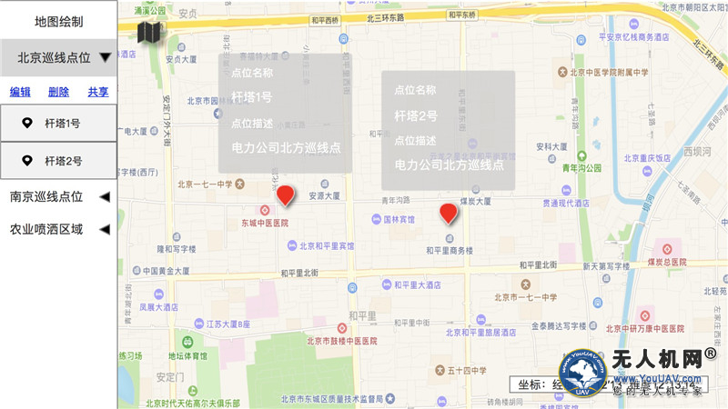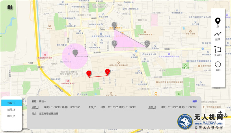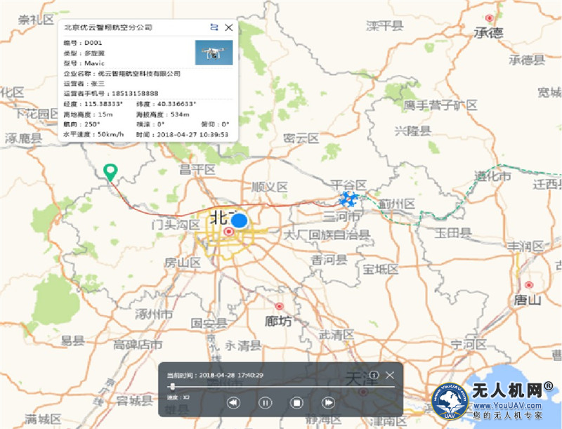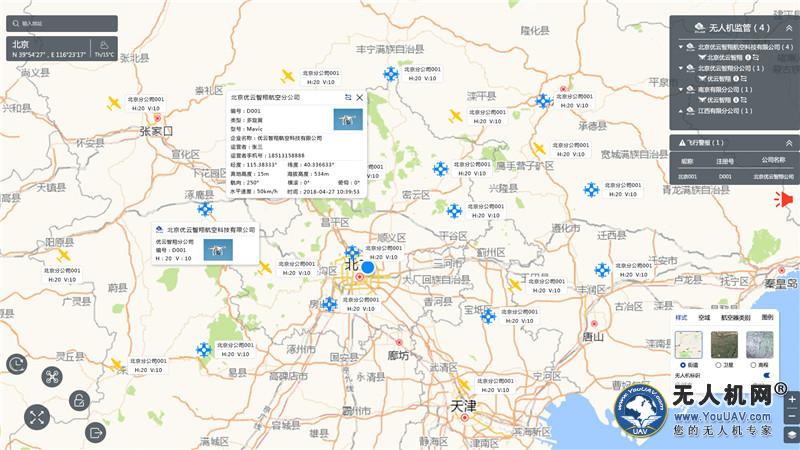 轻小民用无人机运行动态数据库系统,用于向无人机用户提供航行服务、气象服务等,对民用无人机运行数据(包括运营信息、位置、高度和速度等)进行实时监测。接入系统的无人机应即时上传飞行数据,无人机云系统对侵入电子围栏的无人机具有报警功能。