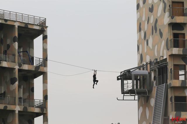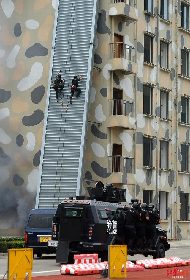 ↑演练现场,建筑物附近发生爆炸。特警“黑豹”突击队立即全副武装,火速赶赴现场