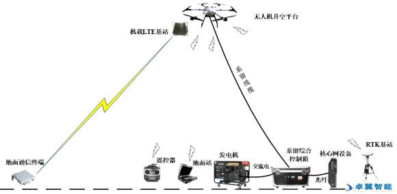 地面系统:系留综合控制箱、发电机、地面站、遥控器、地面通信终端、地面通信核心网(用于管理LTE基站)设备。
