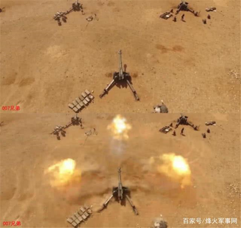 66式火炮开火瞬间,炮口焰还是很大的。俯拍的角度,可以清楚地看到多门火炮呈交错布置,左边是堆积的弹药箱,火炮驻锄等位置挖筑了简易支撑点。牵引式火炮一般靠人力装填,持续射速也就2-3发每分钟,只有自行榴弹炮的一半不到。但是牵引式火炮价格只有自行火炮的五分之一,加装信息化的目标解算、射击指挥设备后,作战能力也是足够应对很多情况的。