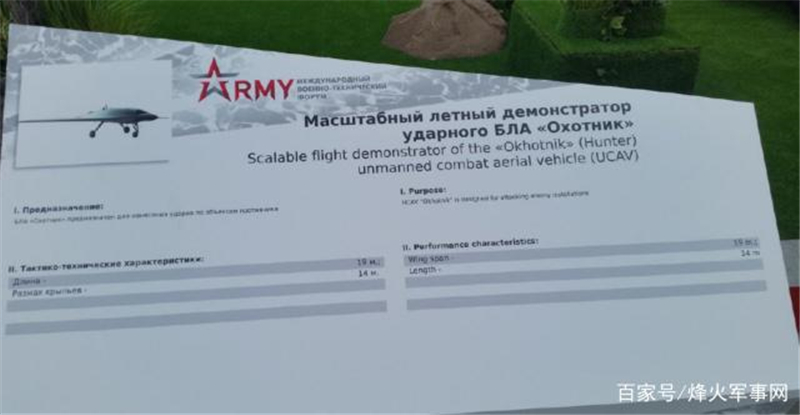 不过最关键的还是展板上的这组数据:“猎人-B”无人机翼展19米,长度14米!这是什么概念呢?美国空军隐身重型战斗机F-22,长度18.9米,宽度13.56米。换句话说,俄罗斯这架无人作战飞机,尺寸跟F-22重型隐身战斗机如出一辙,远远超过世界上其他的同类无人战机。