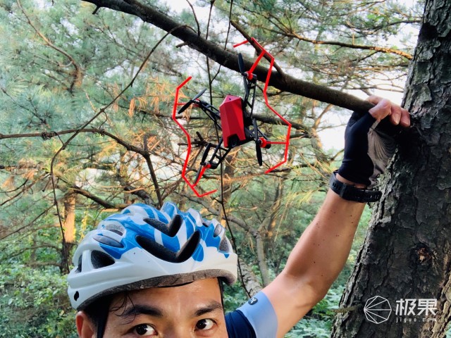 笔者抱着大树一顿猛晃一边晃终于把无人机给晃下来了一点,不过还是挂在了离地有六米多高的树干上!没办法爬树吧……
