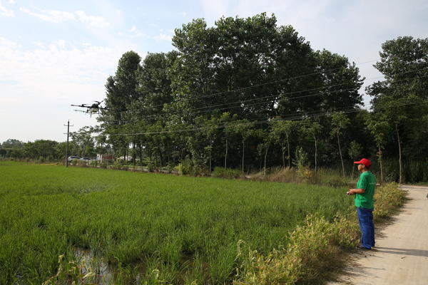 7月3日,潢川县魏岗乡农富种植养殖专业合作社的糯稻实验基地,与往日“面朝黄土背朝天”的农忙景象不同,田间只有两位无人机操作员在田边操作植保无人机在水稻田上方均匀的喷洒药水。