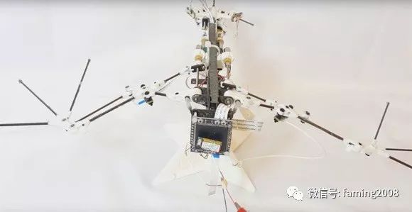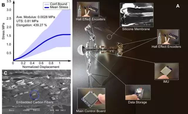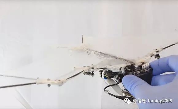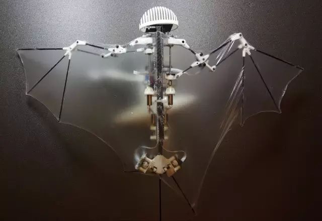 仿生蝙蝠拥有复杂的襟翼,而重量也仅有93克,它是一种完全自我控制的机器人,装有多个传感器和一个处理器,帮助它在飞行过程中自我定位,以及确定肘、臀部和关节的相对位置。研究人员没有为Bat Bot B2的每个关节安装致动器,而只是为翼关节安装了制动器,从而使机体更薄、更轻。蝙蝠机器人的机翼是由柔性硅胶膜制成的,只有56微米厚。