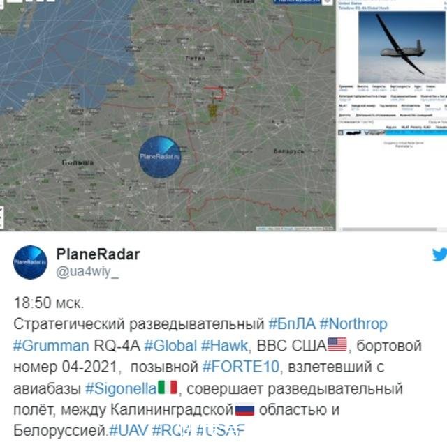这架编号04-2021的无人机从意大利空军基地起飞,于莫斯科时间18时50分出现在加里宁格勒州与白俄罗斯之间。