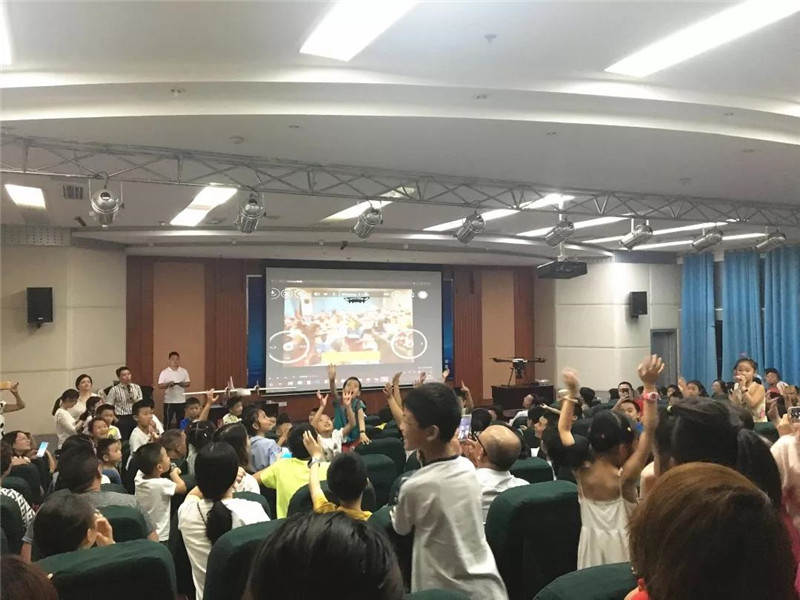 最后,还在大讲堂内上空进行了小型遥控四轴无人机的飞行表演和第一视角飞行表演。