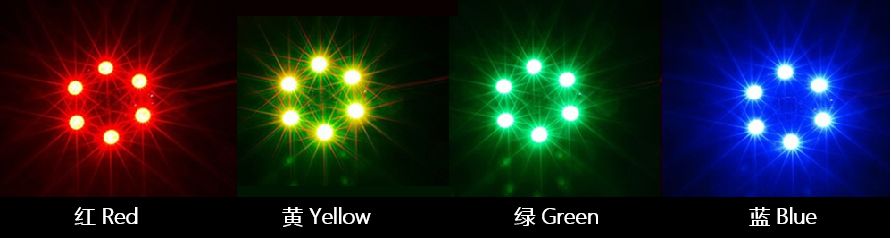 (5)指示灯:飞行器尾部应安装长度不小于2cm,亮度须保障在白天阳光下能辨识颜色,4色可调节的LED指示灯。LED指示灯应常亮不得闪烁,具体颜色定义如下图所示: