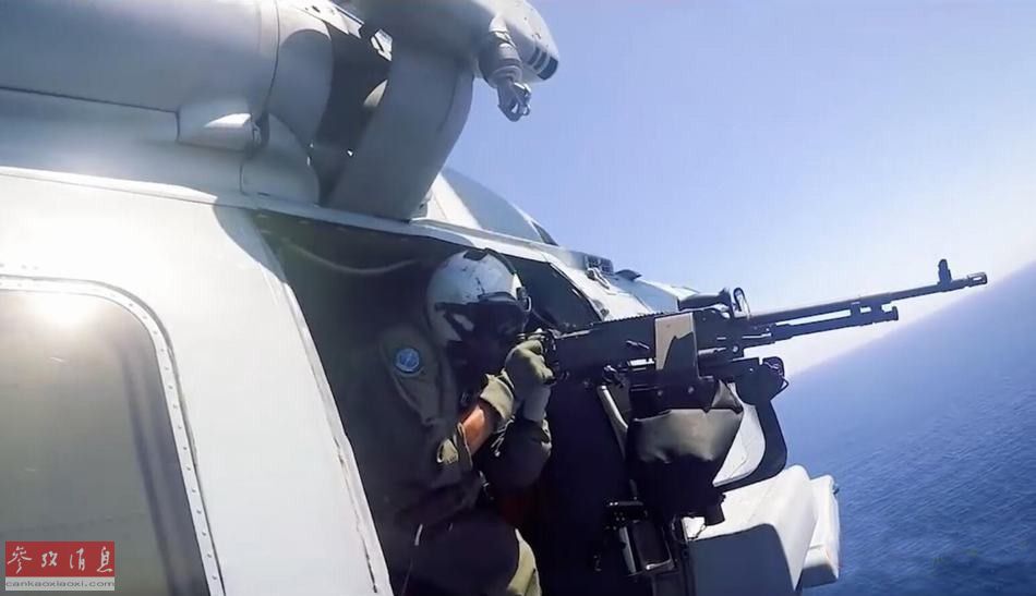 “骑士鹰”直升机舱门炮手准备使用12.7毫米M3航空机枪射击无人机靶标。