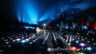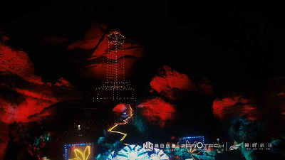 在峡谷之中,我们凭着先进的定位系统,稳定的飞机性能,强大的操控系统,与团队的众志成城,克服了舞台上方空间不充分,地形严重阻挡信号的问题,消除了双编队阵信号互相干扰的可能性,让TAKE与ROC无人机编队同步起飞,精准地执行舞步,呈现与舞台完美联动的惊艳效果!