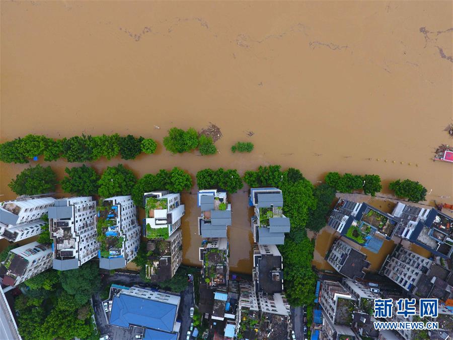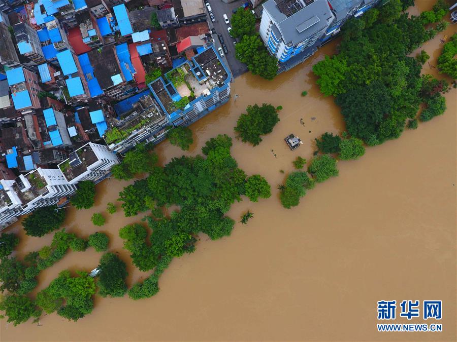 7月10日,柳州市滨江西路被上涨的洪水淹没(无人机拍摄)。 受近日持续强降雨影响,广西柳州市区柳江水位快速上涨。7月10日3时45分,柳江柳州水文站出现83.26米的洪峰水位,超过警戒水位0.76米。这是柳江今年首个超警戒水位洪峰,柳州市区部分沿江低洼地带出现积水。