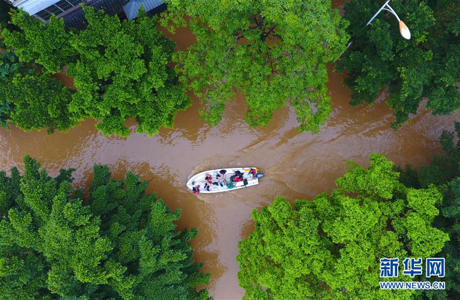 7月10日,在柳州市滨江西路,医务人员用冲锋舟救援病人(无人机拍摄)。 受近日持续强降雨影响,广西柳州市区柳江水位快速上涨。7月10日3时45分,柳江柳州水文站出现83.26米的洪峰水位,超过警戒水位0.76米。这是柳江今年首个超警戒水位洪峰,柳州市区部分沿江低洼地带出现积水。
