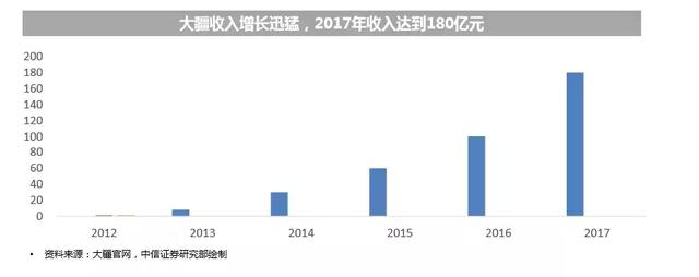 在2015年大疆创新营收大概60亿元,2016年是近100亿元。2017年收入更是达到180亿元,同比增长约80%。绝大部分收入来自消费级无人机,约80%来自海外市场。
