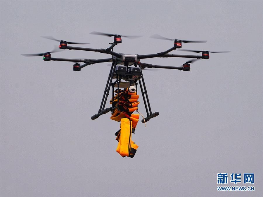 7月13日,公安干警进行警用无人机投掷救生衣演练。新华社记者 邢广利 摄