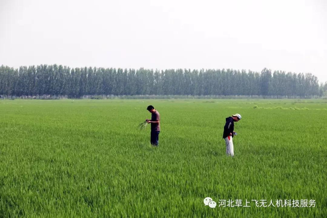 农业技术专家查看水稻成长情况