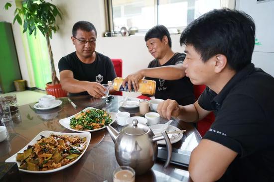 忙完上午的活儿,杨冲团队四人来到镇上的餐馆吃午饭。“如果是去外地打药,经常是忙得吃不上饭,也没地儿吃饭。”杨冲无奈地表示。