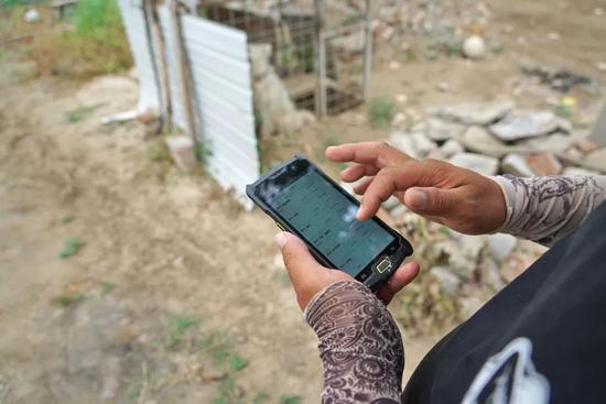 手持一根细长、近似“蘑菇头”般的测绘器,王群开始沿着整片地的四周进行测绘,标定出需要喷洒农药的水稻田范围以及面积。这些数据将实时传到无人机平台极飞云的后台,以便于无人机能够更加精准地喷洒农药。